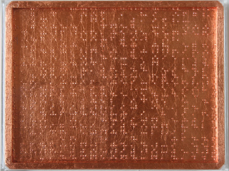 copper leaf on brailled paper transcription of Love Will Tear Us Apart lyrics