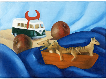 The message I express through my paintings is that violence is both a barbaric way to deal with conflict and a senseless form of self-expression. The medium through which I articulate this view is still life painting. By employing vibrant colours, symbolism, confrontational composition and a style that is not contemporarily associated with political art, I believe my message is amplified. In this series I have used organic materials and toys to contrast perpetrators with victims; violence with peace; and destruction with sustenance.