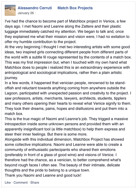 Below is a facebook message we recieved from one of our Venice collaborators. His response is exactly why we are creating People Make Places!